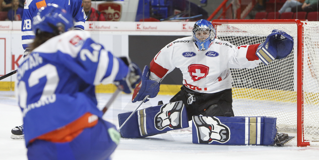 WK20230731_1784 31. Juli 2023 1050 × 526 Schweiz bezwingt die Slowakei TRENCIN, SLOVAKIA, Pavol Demitra Ice Stadium, 31.Jul. 2023 – Preliminary Round, SVK vs. SUI. Image shows Jan CHOVAN #22 (Slovakia) & Christian KIRSCH #1 (Switzerland). Photo: © Werner Krainbucher