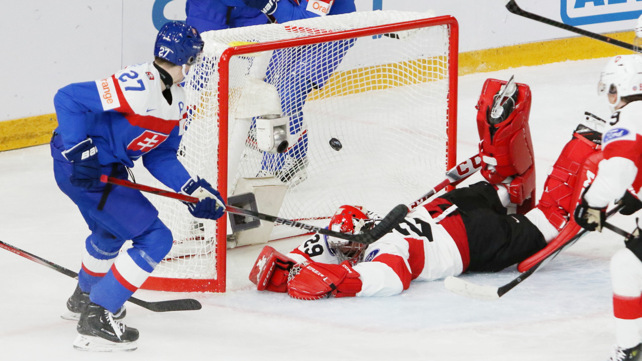 6T4A2088 27. Dezember 2023 2560 × 1440 WJC – Schweiz bleibt gegen die Slowakei torlos IIHF World Juniors 2024 SVK – SUI, Samuel Honzek #27, Alessio Beglieri #29, Thierry Schild #9 Frolundaborg Arena, © Puckfans.at / Andreas Robanser