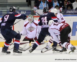 Slovan Bratislava – Dinamo RigaKHL Saison 2015-16Slofnaft Arena BratislavaIvan Svarny #51, Joacim Eriksson #30, Rok Ticar #24