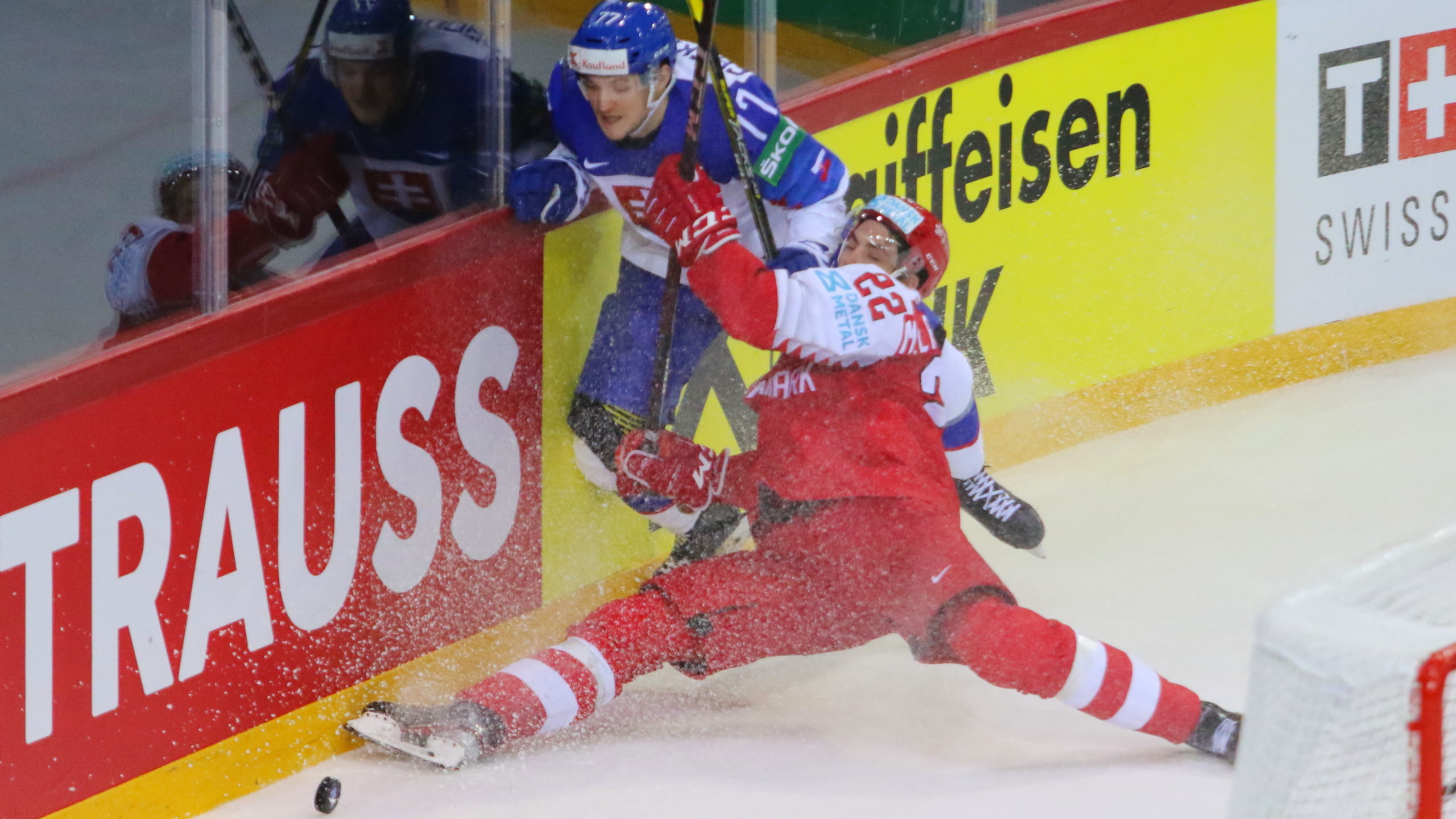 pfIMG_0049_3 29. Mai 2021 2560 × 1440 Slowaken wieder auf Platz 1 IIHF World Championship 2021 SVK – DEN Martin Fasko-Rudas #77,Markus Lauridsen #22 Olympic Sports Centre © Puckfans.at/Andreas Robanser