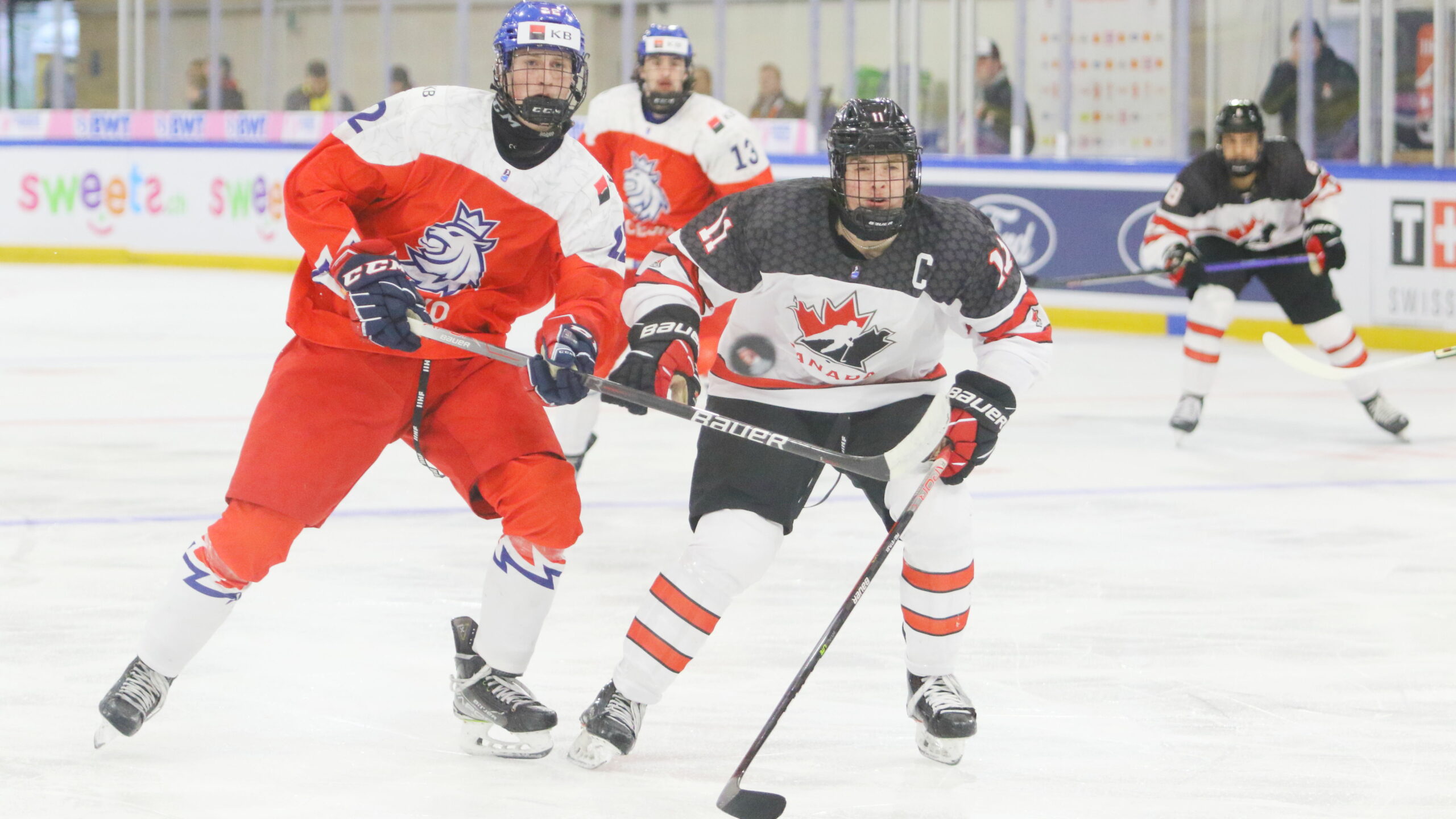 6T4A9214 25. April 2023 2560 × 1440 Team Canada feiert 8:3 Sieg über Tschechien IIHF U18 World Championship CZE – CAN Jiri Felcman #22, Cameron Allen #11 Raiffeisen Arena, Porrentruy (Ajoie) © Puckfans.at / Andreas Robanser