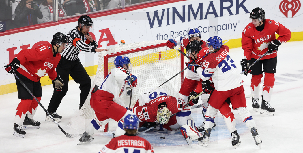 ST. PAUL, USA, 04, Jan, 2026, World Juniors, Semifinals, CAN vs. CZE. Image shows Tij IGINLA #11 (Canada), Petr SIKORA #17 (Czech Republic), Michal ORSULAK #30 (Czech Republic), Vojtech CIHAR #15 (Czech Republic), Porter MARTONE #22 (Canada), Tomas GALVAS #23 (Czech Republic) & Ben DANFORD #14 (Canada). Photo: Werner Krainbucher (Puckfans.at)