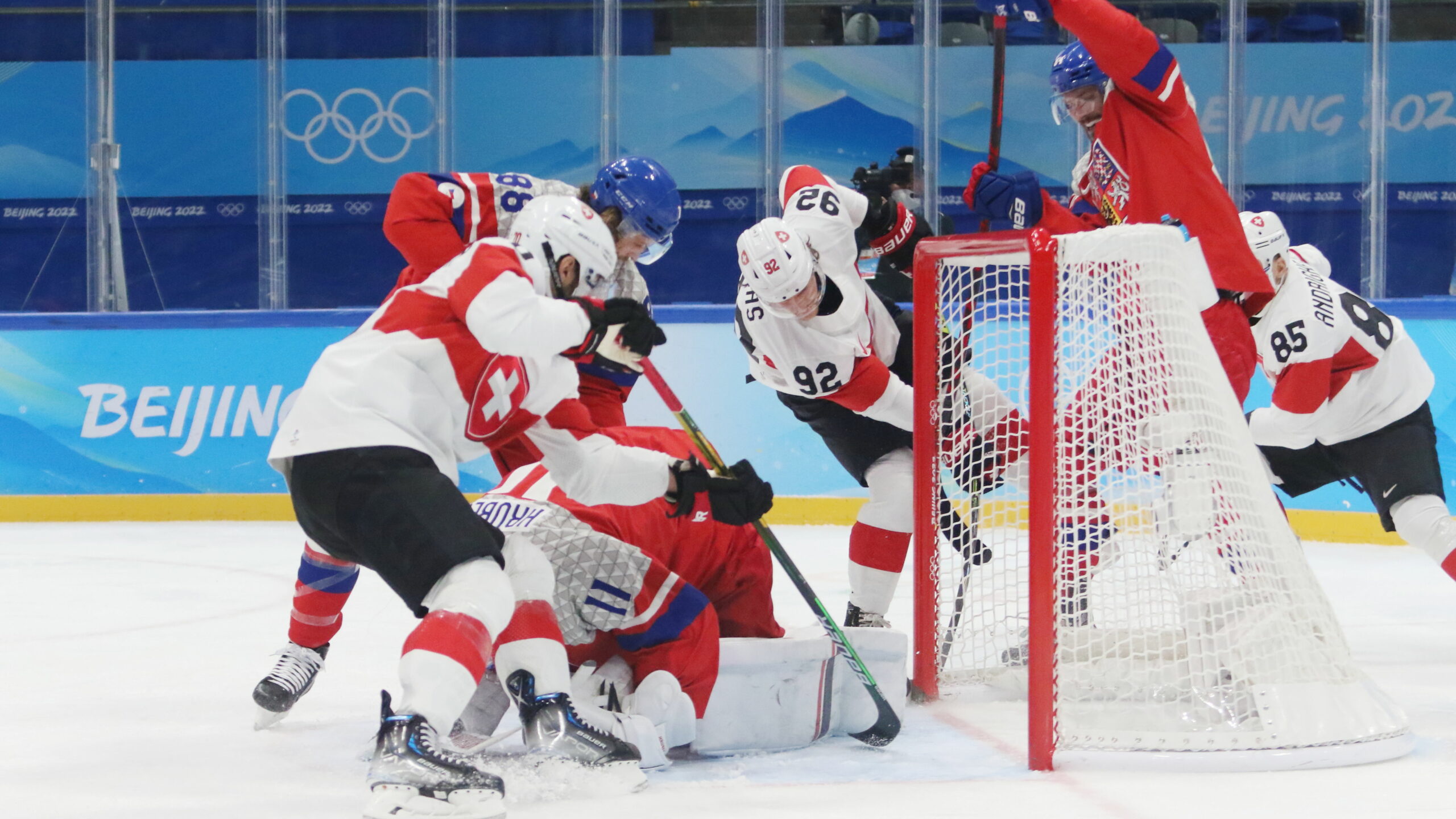 p6T4A8286 11. Februar 2022 2560 × 1440 Tschechien siegt gegen die Schweiz im Shootout Olympic Games 2022, Hockey Tournament Men Group B CZE – SUI Denis Hollenstein #70, Gaëtan Haas 92, Libor Sulak #88, National Indoor Stadium, Beijing © Andreas Robanser