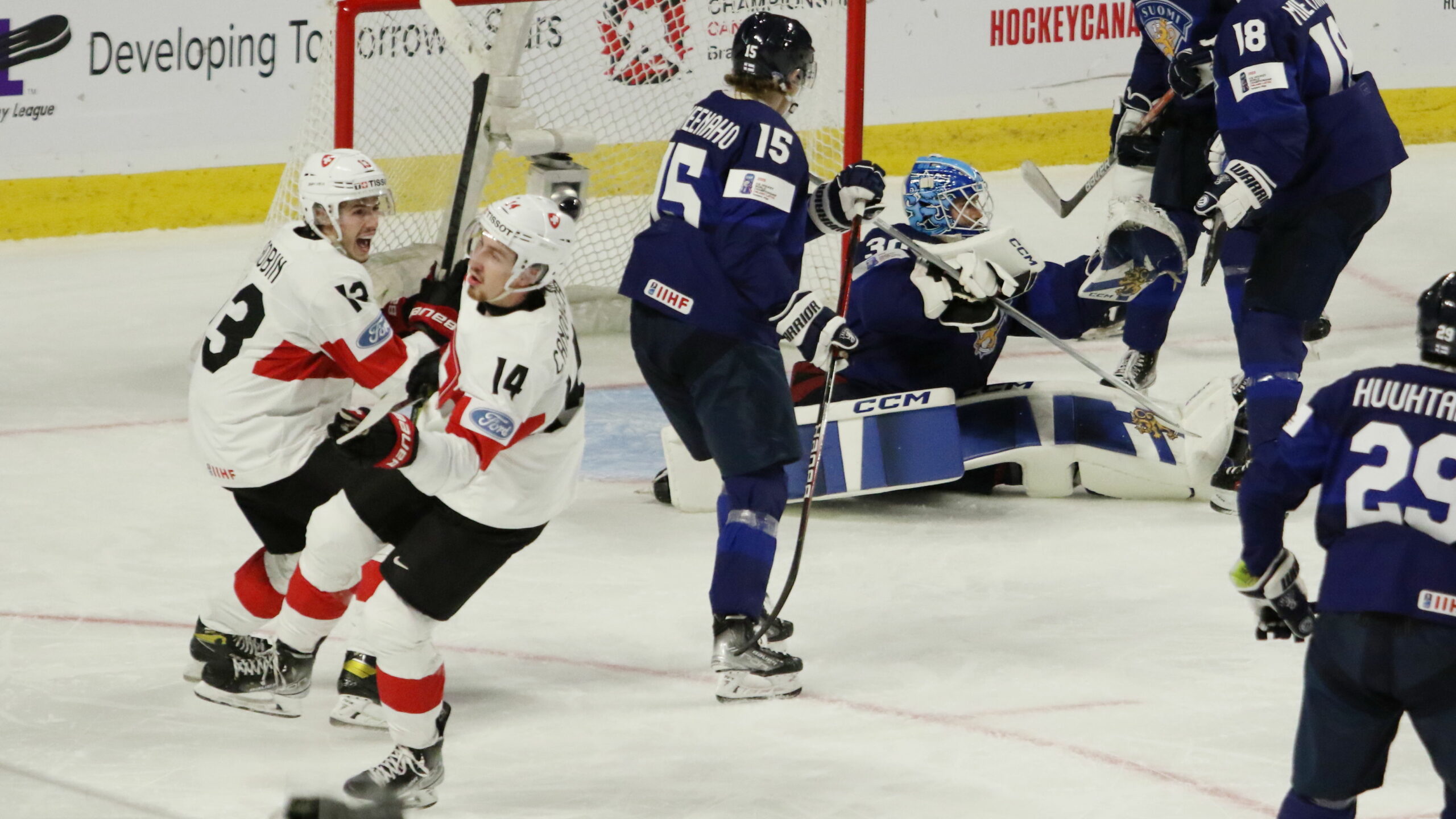 6T4A0836 26. Dezember 2022 2560 × 1440 U20 – Schweizer Team startet mit Sieg gegen Vizeweltmeister IIHF World Juniors 2023 FIN – SUI Louis Robin #13, Lorenzo Canonica #14, Lenni Hameenaho #15, Aku Koskenvuo #30 Avenir Centre, Moncon, © Puckfans.at / Andreas Robanser
