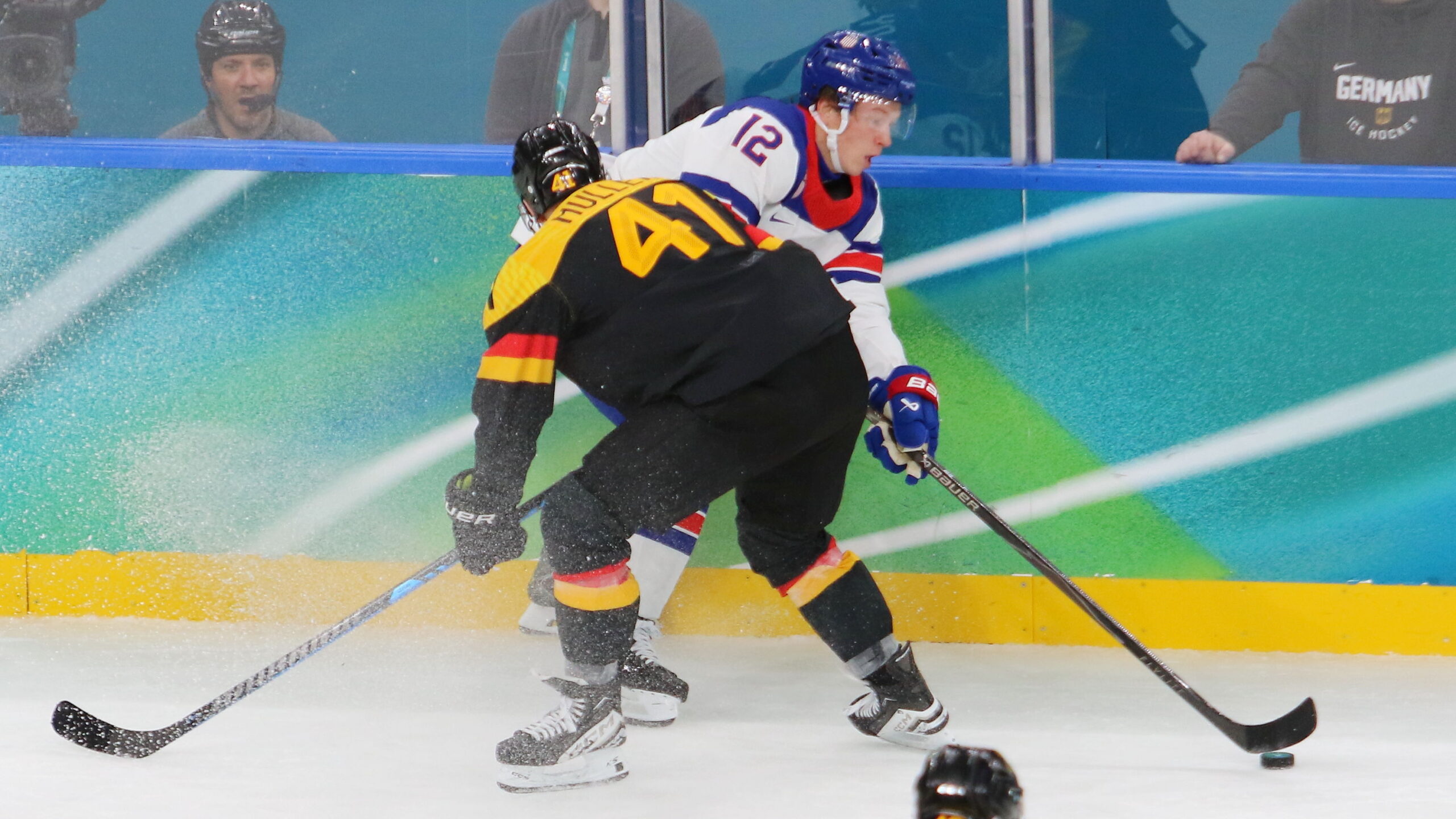 a6T4A0484 15. Februar 2026 2560 × 1440 USA erfüllt die Pflicht gegen Deutschland Jonas Muller #41, Matt Boldy #12, Olympic Games 2026 Mens Hockey USA – GER , Santa Giulia Arena, Milano © Puckfans.at / Andreas Robanser
