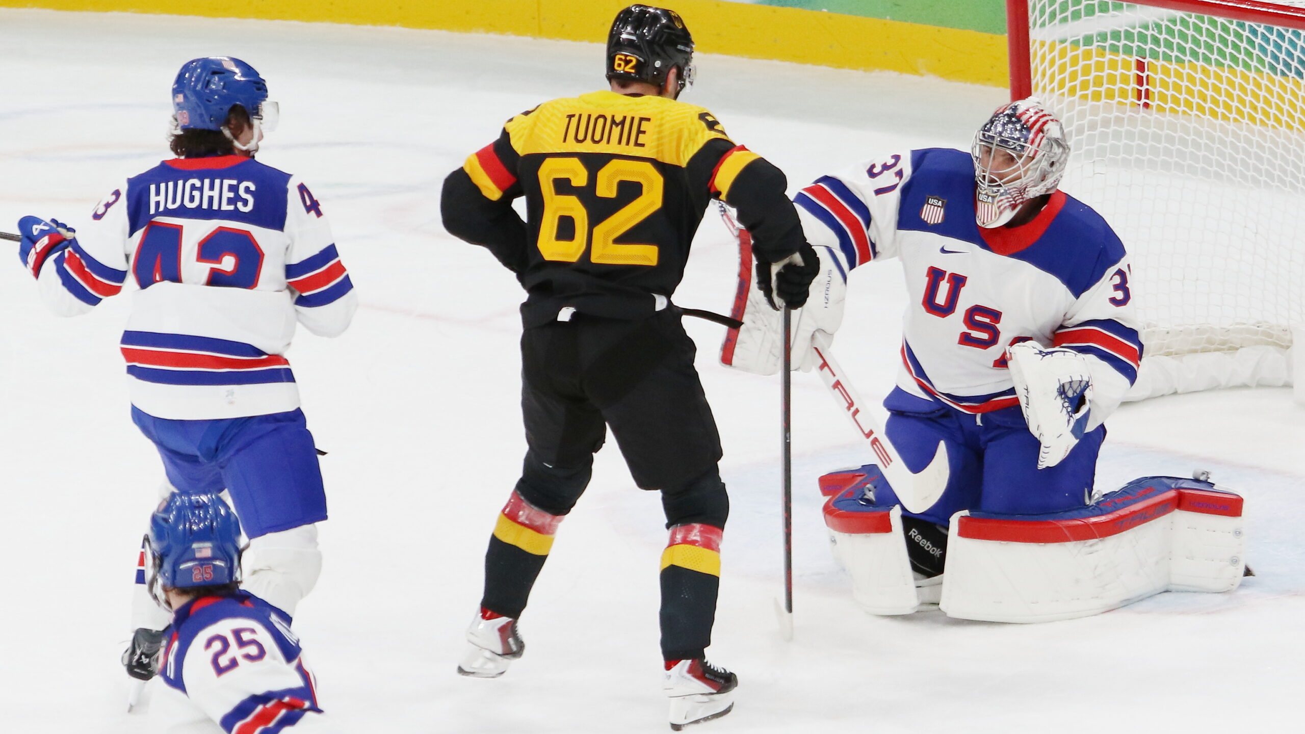 ar6T4A0514 15. Februar 2026 2560 × 1440 USA erfüllt die Pflicht gegen Deutschland Quinn Hughes #43, Parker Tuomie #62, Connor Hellebuyck #37, Olympic Games 2026 Mens Hockey USA – GER , Santa Giulia Arena, Milano © Puckfans.at / Andreas Robanser