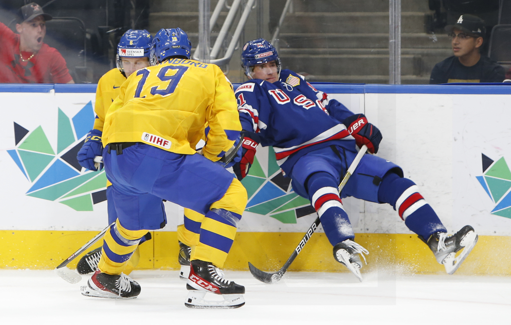 WK20220814_0718 15. August 2022 1050 × 668 USA holt sich Gruppensieg EDMONTON, CANADA, 14.Aug. 2022 – Preliminary Round, USA vs. SWE. Image shows Mans FORSFJÄLL #6 (Sweden), Victor STJERNBORG #19 (Sweden) & Mackie SAMOSKEVICH #11 (USA). Photo: Werner Krainbucher