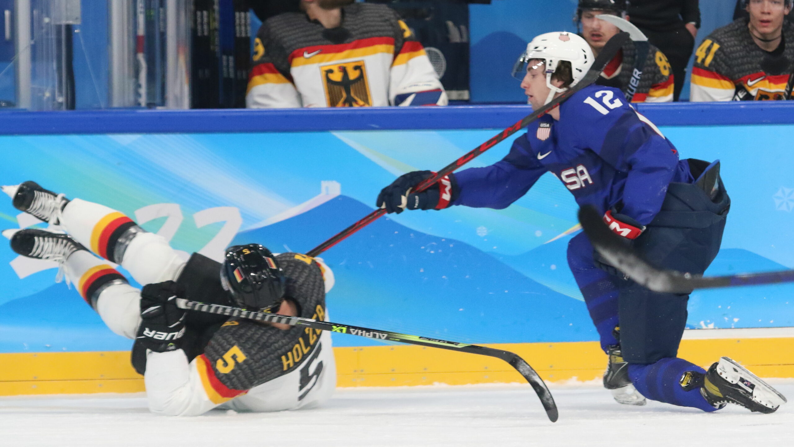 p6T4A9602 13. Februar 2022 2560 × 1440 USA und Kanada siegreich Olympic Games 2022 Hockey Tournament Men Group A USA – GER Korbinian Holzer #5, Sam Hentges #12 Wukesong Sports Centre, Beijing © Andreas Robanser