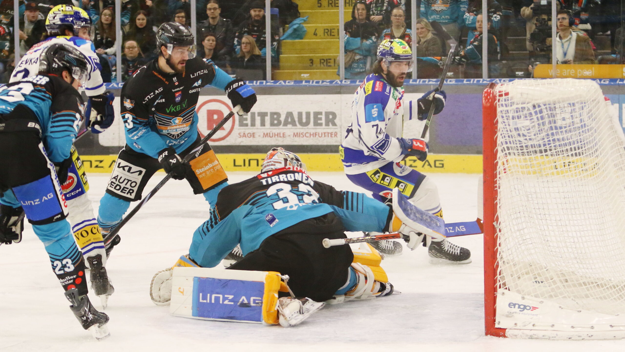 Greg Moro #3, Rasmus Tirronen #32, Joël Teasdale #74, ICEHL Pre-Playoff Game 2 Black Wings Linz – EC VSV , Linz AG Eisarena, © Puckfans.at / Andreas Robanser