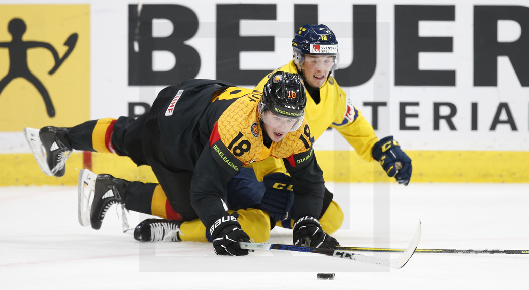 GOTHENBURG, SWEDEN, 28.Dec. 2023 – World Juniors, GER vs. SWE. Image shows Luca HAUF #18 (Germany) & Noah ÖSTLUND #12 (Sweden). Photo: Werner Krainbucher
