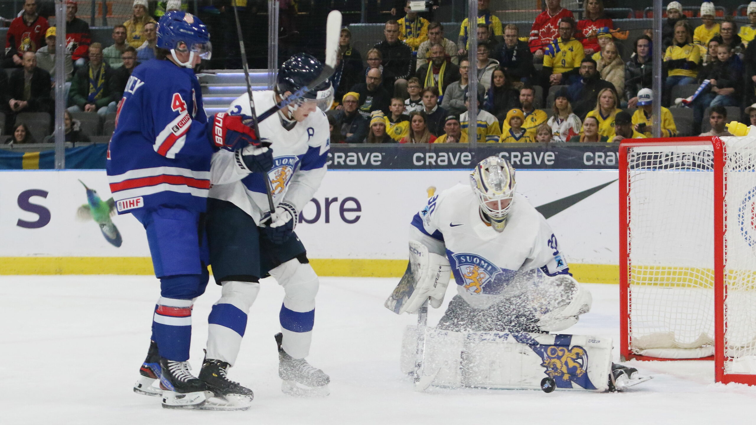 6T4A8610 4. Januar 2024 2560 × 1440 WJC – USA dreht ein 0:2 auf ein 3:2 IIHF World Juniors 2024 Semifinal USA – FIN Gavin Brindley #4, Otto Salin #3, Niklas Kokko #30 Arena Scandinavium, © Puckfans.at / Andreas Robanser