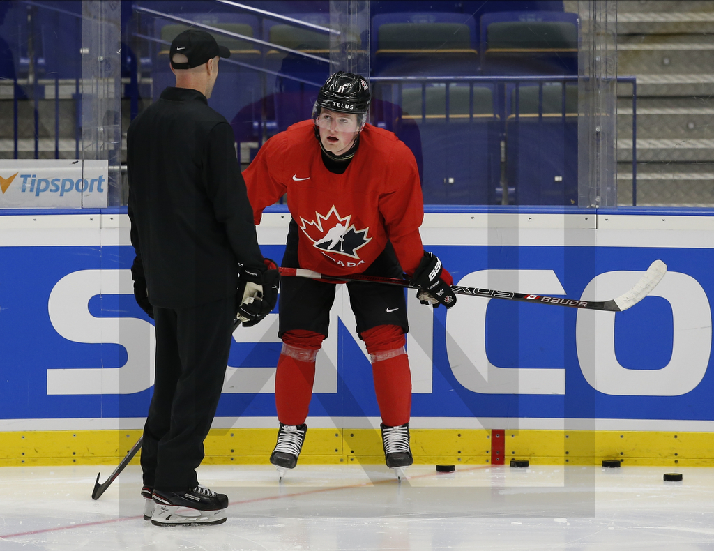 OSTRAVA, CZECH REPUBLIC, 01.Jan. 2020 – World Juniors, Training Team Canada. Image shows Mitch LOVE, Assistant Coach (Canada) & Alexis LAFRENIERE #11 (Canada). Photo: Werner Krainbucher