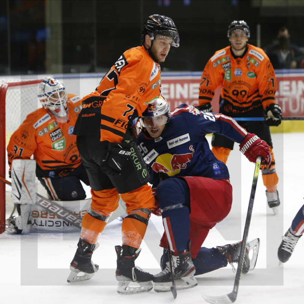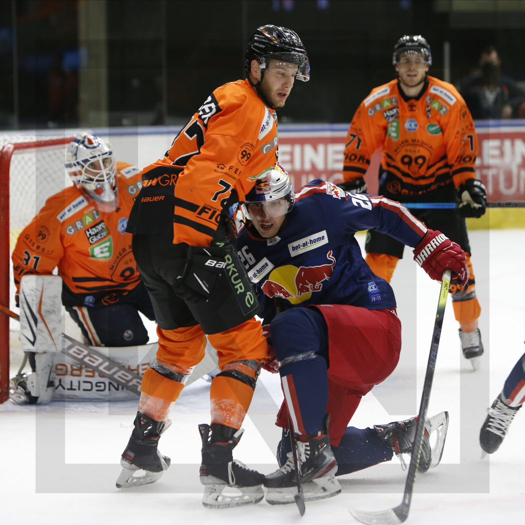 GRAZ, AUSTRIA, 09.Dec. 2020 – Moser Medical Graz 99ers vs. EC Red Bull Salzburg. Image shows Olivier RODRIGUE #31 (Moser Medical Graz 99ers), Kevin MODERER #72 (Moser Medical Graz 99ers), Peter HOCHKOFLER #26 (EC Red Bull Salzburg) & Erik KIRCHSCHLÄGER #71 (Moser Medical Graz 99ers). Photo: Werner Krainbucher