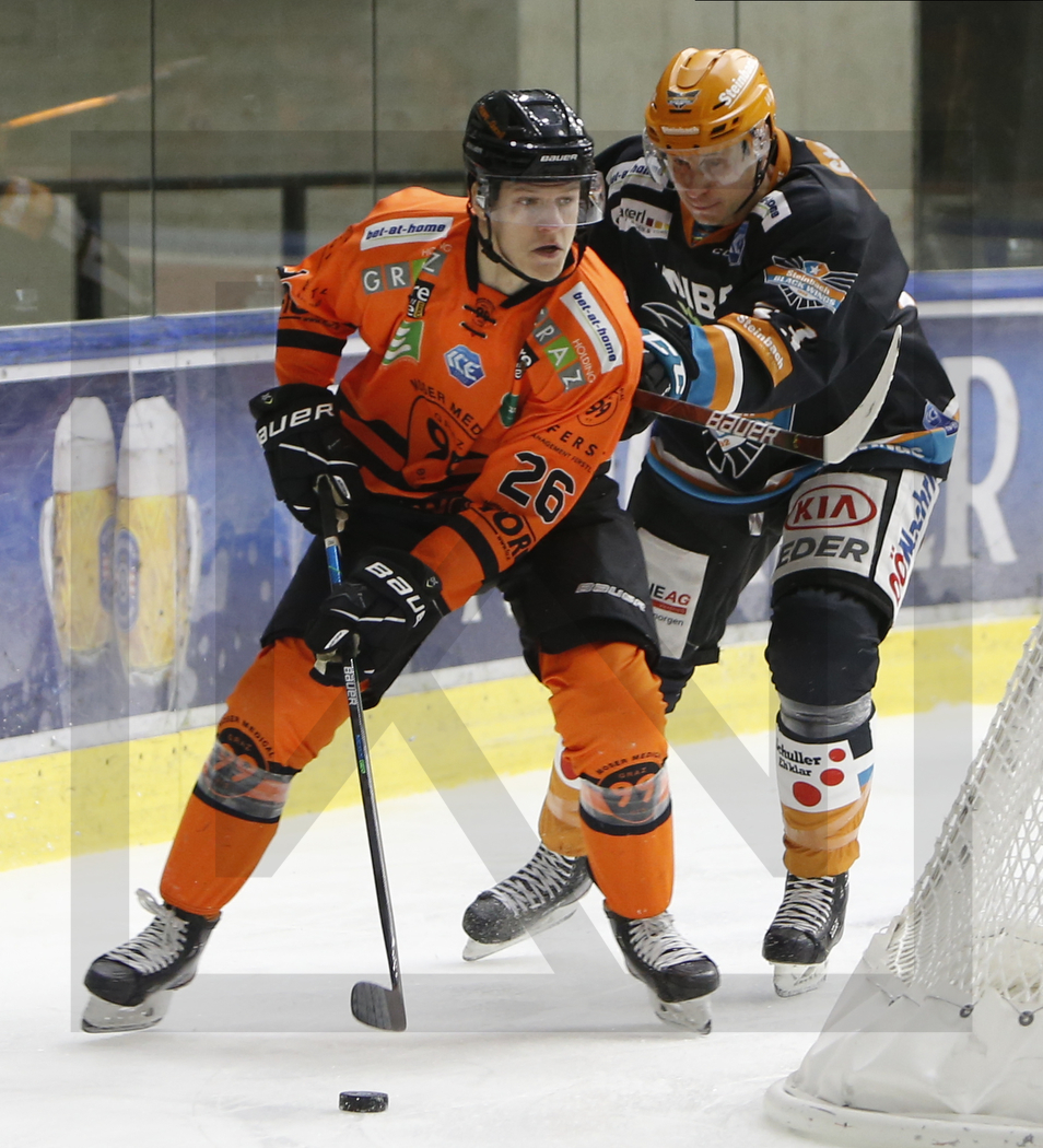 GRAZ, AUSTRIA, 17.Dec. 2020 – Moser Medical Graz 99ers vs. Steinbach Black Wings 1992. Image shows Dominik GRAFENTHIN #26 (Moser Medical Graz 99ers) & Oskars BARTULIS #73 (Steinbach Black Wings 1992). Photo: Werner Krainbucher