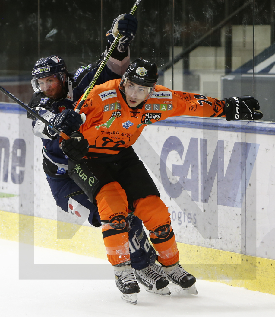 GRAZ, AUSTRIA, 19.Dec. 2020 – Moser Medical Graz 99ers vs. Hydro Fehervar AV 19. Image shows Istvan BARTALIS #10 (Hydro Fehervar AV 19) & Daniel OBERKOFLER #74 (Moser Medical Graz 99ers). Photo: Werner Krainbucher