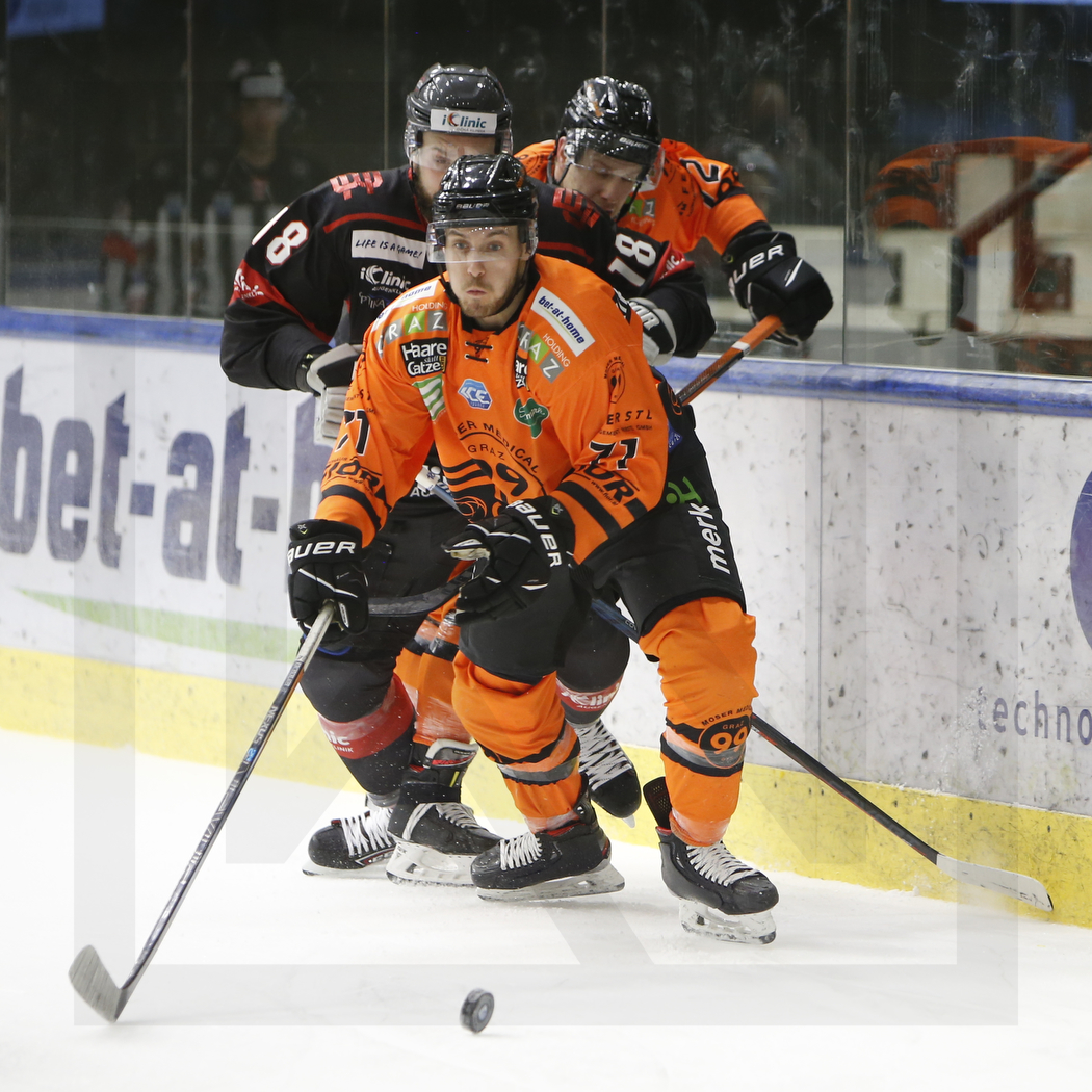 GRAZ, AUSTRIA, 15.Jan. 2021 – Moser Medical Graz 99ers vs. Iclinic Bratislava Capitals. Image shows Denis HUDEC #18 (Iclinic Bratislava Capitals), Erik KIRCHSCHLÄGER #71 (Moser Medical Graz 99ers) & Kevin MODERER #72 (Moser Medical Graz 99ers). Photo: Werner Krainbucher
