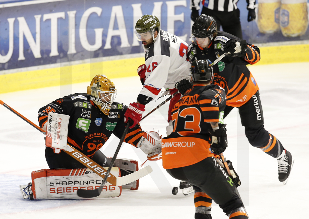GRAZ, AUSTRIA, 31.Jan. 2021 – Moser Medical Graz 99ers vs. HCB Südtirol Alperia. Image shows Felix NUSSBACHER #35 (Moser Medical Graz 99ers), Angelo MICELI #26 (HCB Südtirol Alperia), Mario ALTMANN #73 (Moser Medical Graz 99ers) & Charles DODERO #92 (Moser Medical Graz 99ers). Photo: Werner Krainbucher