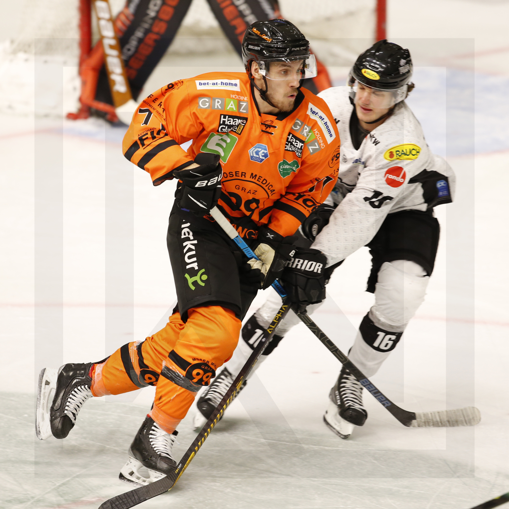 GRAZ, AUSTRIA, 05.Feb. 2021 – Moser Medical Graz 99ers vs. Dornbirn Bulldogs. Image shows Erik KIRCHSCHL?GER #71 (Moser Medical Graz 99ers) & Simeon SCHWINGER #16 (Dornbirn Bulldogs). Photo: Werner Krainbucher