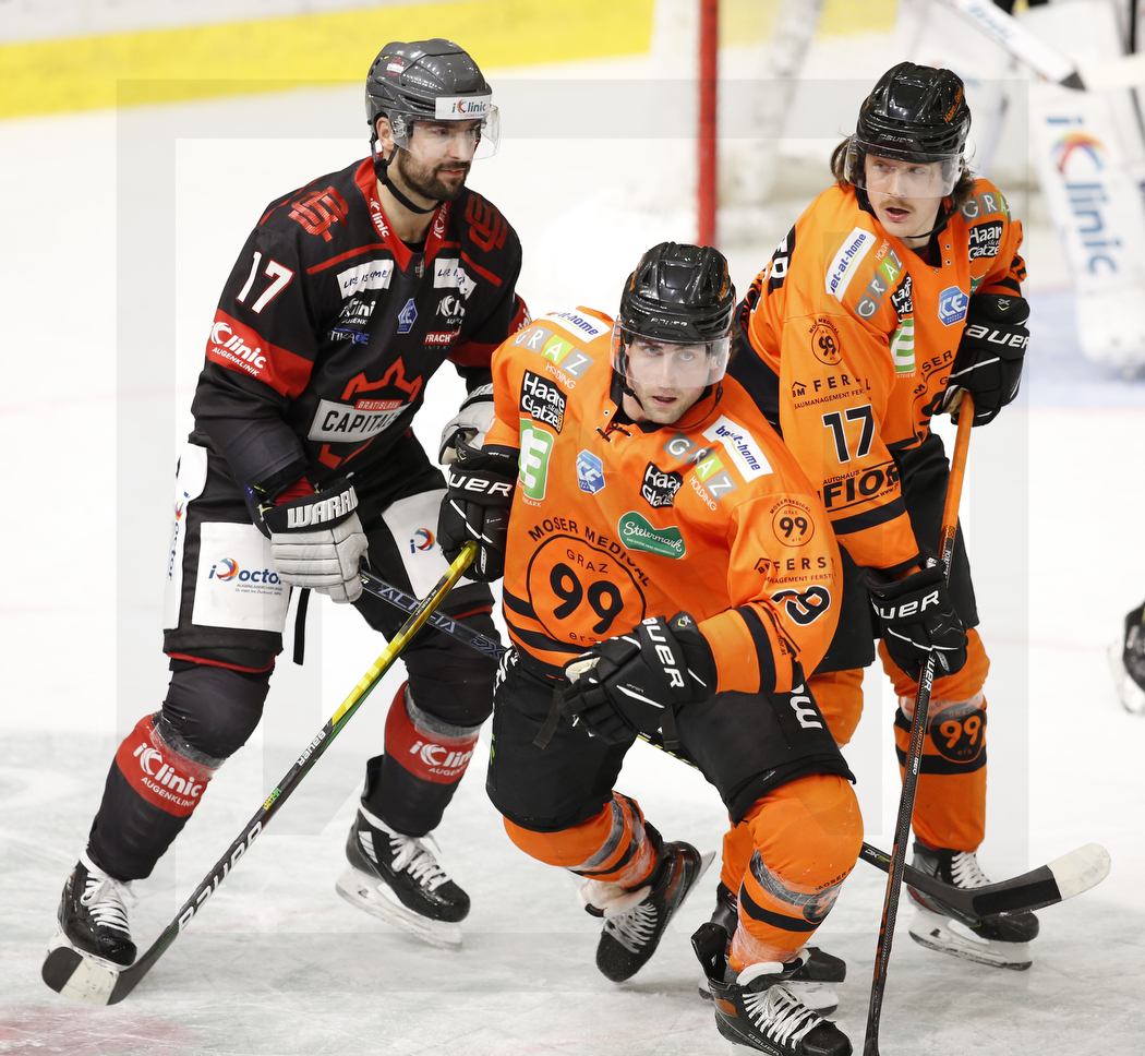 GRAZ, AUSTRIA, 02.Mar. 2021 – Qualification Round; Moser Medical Graz 99ers vs. Iclinic Bratislava Capitals. Image shows David BUC #17 (Iclinic Bratislava Capitals), Joel BRODA #29 (Moser Medical Graz 99ers) & Johan PORSBERGER #17 (Moser Medical Graz 99ers). Photo: Werner Krainbucher