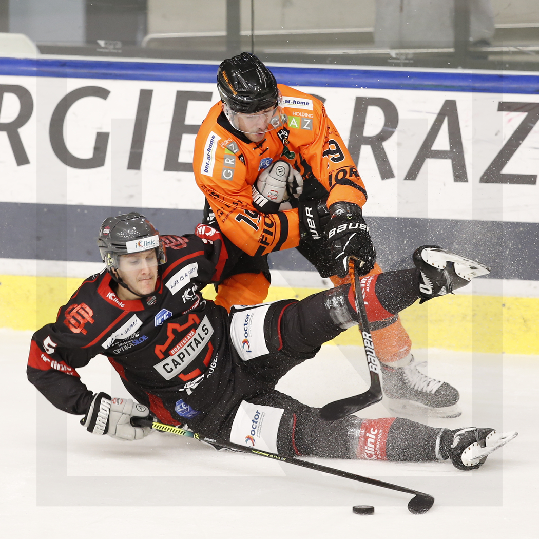 GRAZ, AUSTRIA, 02.Mar. 2021 – Qualification Round; Moser Medical Graz 99ers vs. Iclinic Bratislava Capitals. Image shows Lukas BOHUNICKY #5 (Iclinic Bratislava Capitals) & Lukas KAINZ #19 (Moser Medical Graz 99ers). Photo: Werner Krainbucher