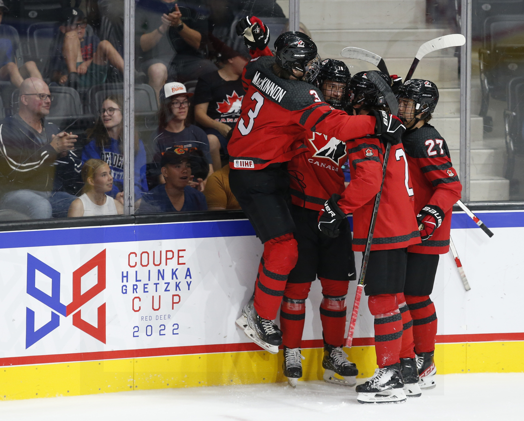 RED DEER, CANADA, Peavey Mart Centrium, 31.Jul. 2022 – Preliminary Round, CAN vs. SUI. Image shows Canadian goal celebration. Photo: © Werner Krainbucher