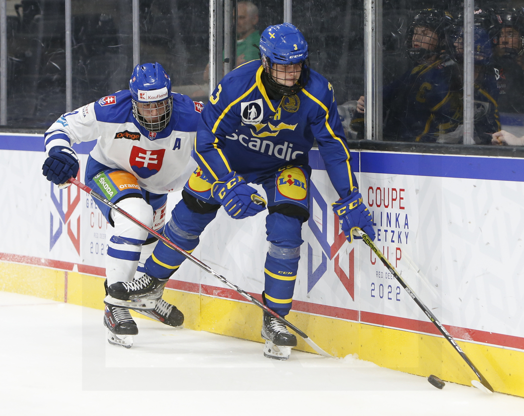 WK20220801_0449 1. August 2022 1050 × 834 WK20220801_0449 RED DEER, CANADA, Peavey Mart Centrium, 01.Aug. 2022 – Preliminary Round, SWE vs. SVK. Image shows Leo EPERJESI #9 (Slovakia) & Axel LANDEN #3 (Sweden). Photo: © Werner Krainbucher