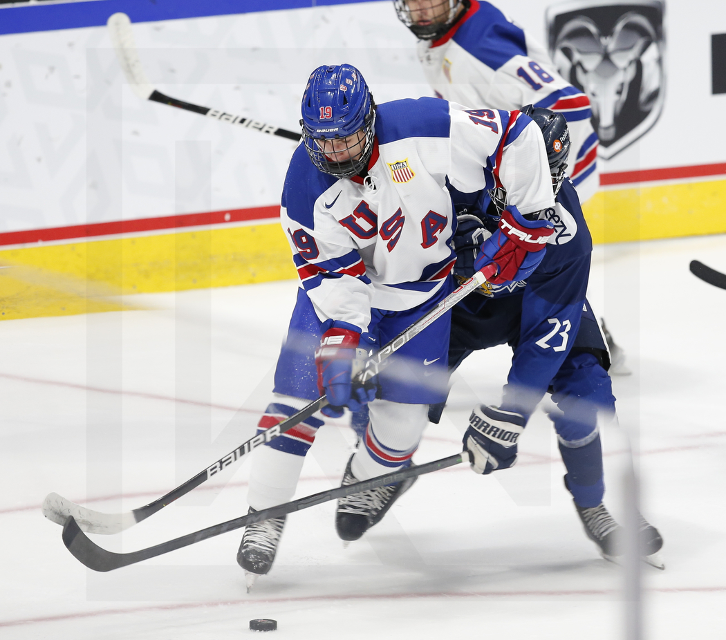 WK20220801_0901A 2. August 2022 1050 × 926 WK20220801_0901A RED DEER, CANADA, Peavey Mart Centrium, 01.Aug. 2022 – Preliminary Round, FIN vs. USA. Image shows Mikey BURCHILL #19 (USA) & Jesse KIISKINEN #23 (Finland). Photo: © Werner Krainbucher