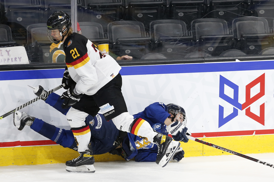 WK20220802_0505 3. August 2022 1050 × 698 WK20220802_0505 RED DEER, CANADA, Peavey Mart Centrium, 02.Aug. 2022 – Preliminary Round, FIN vs. GER. Image shows Julius SUMPF #21 (Germany) & Otso YLITALO #16 (Finland). Photo: © Werner Krainbucher