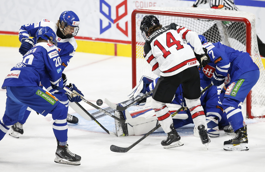 RED DEER, CANADA, Peavey Mart Centrium, 02.Aug. 2022 – Preliminary Round, SVK vs. CAN. Image shows Andrej PARICKA #20 (Slovakia), Richard BARAN #5 (Slovakia), Andreas KRISTALL #14 (Canada), Samuel URBAN #31 (Slovakia) T& Jakub CHROMIAK #7 (Slovakia). Photo: © Werner Krainbucher