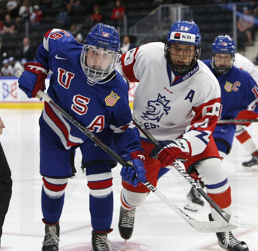 RED DEER, CANADA, Peavey Mart Centrium, 03.Aug. 2022 – Preliminary Round, USA vs. CZE. Image shows Joe CONNOR #16 (USA) & Dominik PETR #29 (Czech Republic). Photo: © Werner Krainbucher