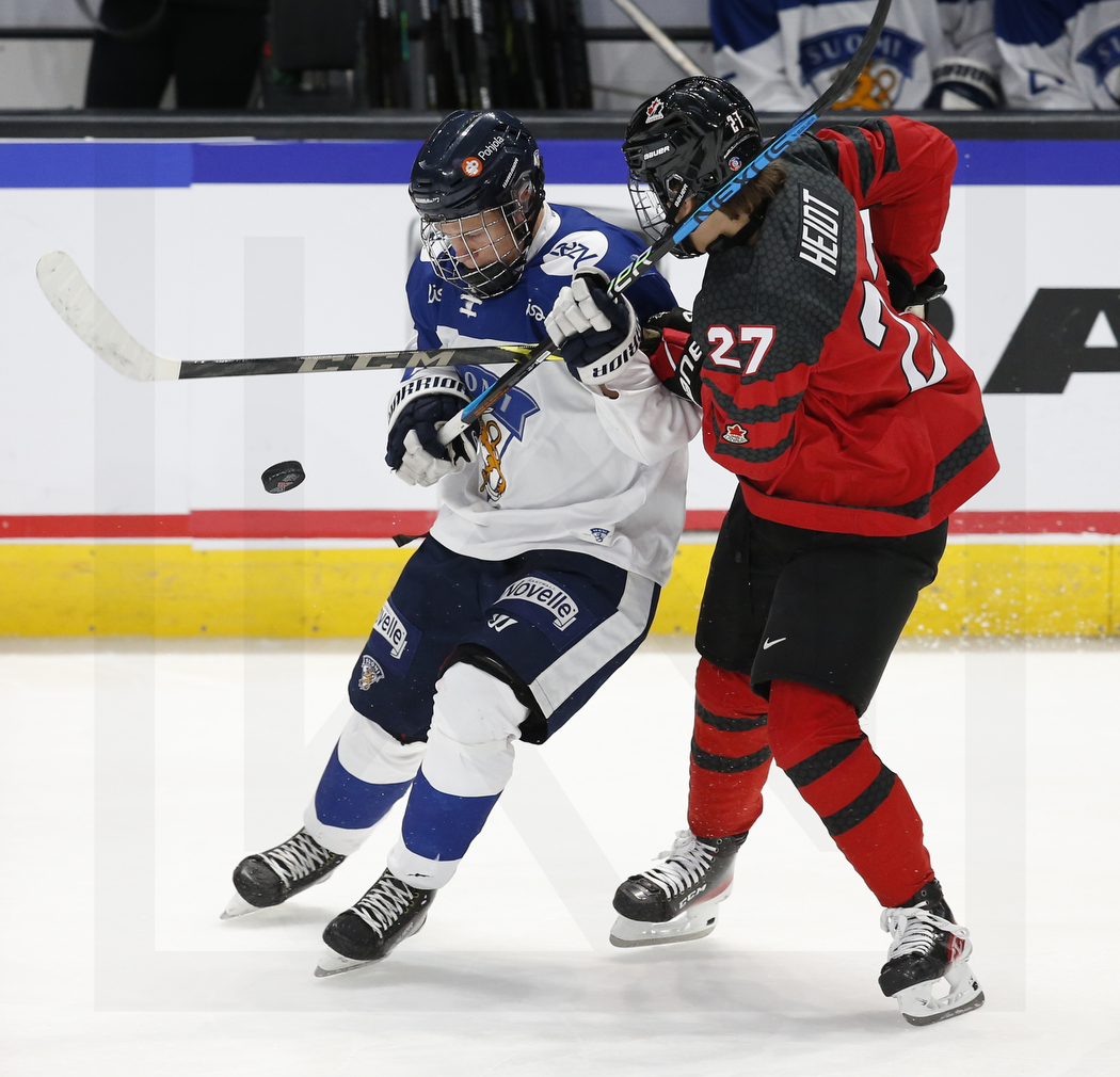 RED DEER, CANADA, Peavey Mart Centrium, 05.Aug. 2022 – Semifinal, CAN vs. FIN. Image shows Maxim ELISEEV #20 (Finland) & Riley HEIDT #27 (Canada). Photo: © Werner Krainbucher