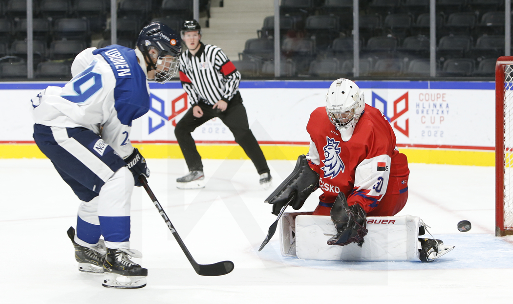 RED DEER, CANADA, Peavey Mart Centrium, 06.Aug. 2022 – Bronze Medal Game, FIN vs. CZE. Image shows Tuomas URONEN #29 (Finland) & Michael HRABAL #30 (Czech Republic). Photo: © Werner Krainbucher