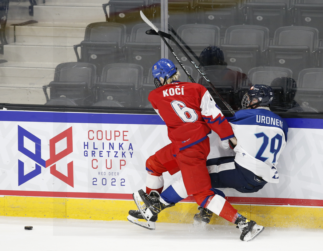 RED DEER, CANADA, Peavey Mart Centrium, 06.Aug. 2022 – Bronze Medal Game, FIN vs. CZE. Image shows Matteo KOCI #6 (Czech Republic) & Tuomas URONEN #29 (Finland). Photo: © Werner Krainbucher