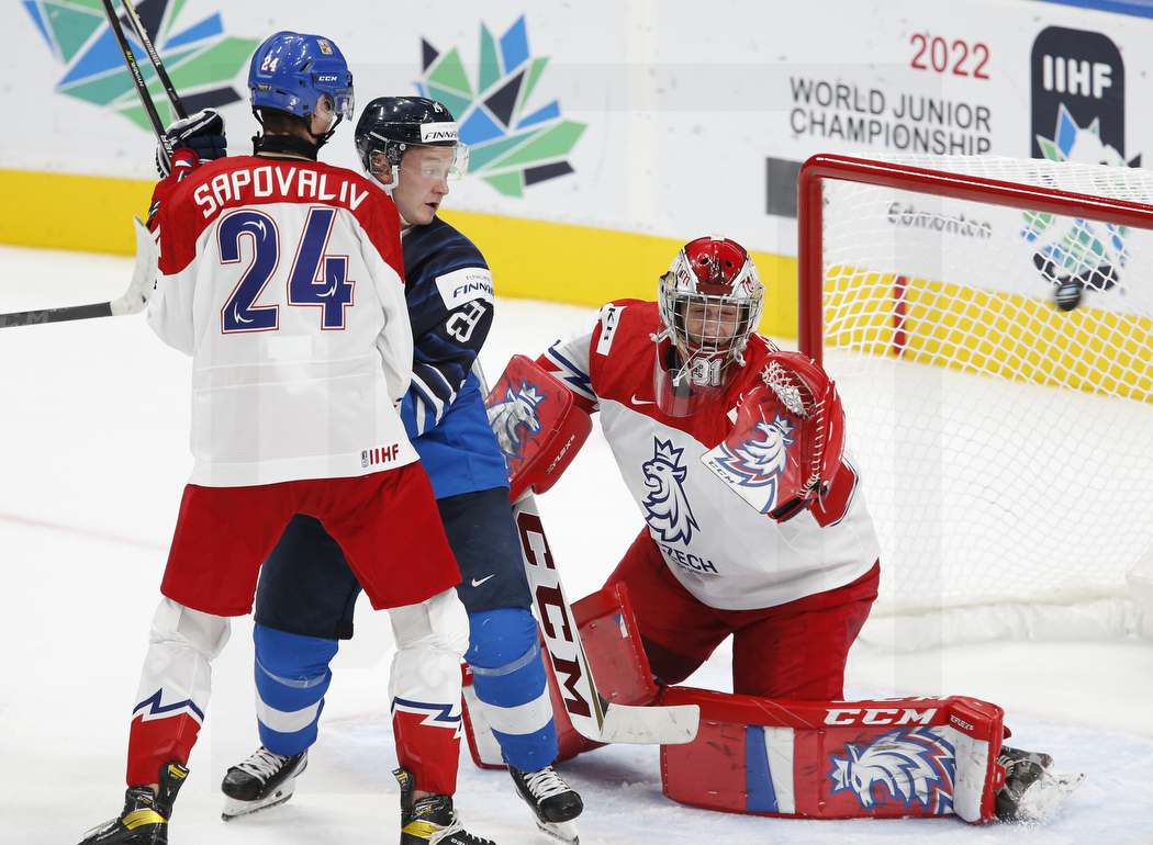 WK20220811_0456 11. August 2022 1050 × 770 WK20220811_0456 EDMONTON, CANADA, 11.Aug. 2022 – Preliminary Round, FIN vs. CZE. Image shows Matyas SAPOVALIV #24 (Czech Republic), Kasper SIMONTAIVAL #29 (Finland) & Jan BEDNAR #2 (Czech Republic). Photo: Werner Krainbucher