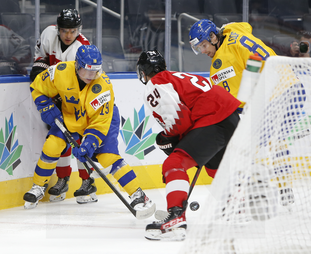 EDMONTON, CANADA, 12.Aug. 2022 – Preliminary Round, AUT vs. SWE. Image shows Oskar MAIER #21 (Austria), Victor STJERNBORG #19 (Sweden), Lucas THALER #24 (Austria) & Leo LÖÖF #8 (Sweden). Photo: Werner Krainbucher