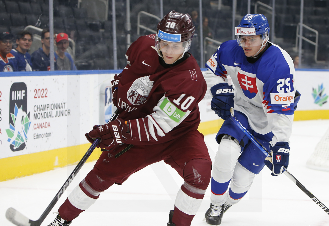 WK20220812_0812 13. August 2022 1050 × 720 WK20220812_0812 EDMONTON, CANADA, 12.Aug. 2022 – Preliminary Round, SVK vs. LAT. Image shows Daniels ANDERSONS #10 (Latvia) & Simon GROCH #25 (Slovakia). Photo: Werner Krainbucher