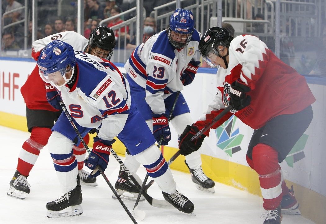 WK20220813_0182 13. August 2022 1050 × 724 WK20220813_0182 EDMONTON, CANADA, 13.Aug. 2022 – Preliminary Round, AUT vs. USA. Image shows Sasha PASTUJOV #12 (USA), Ian SCHERZER #26 (Austria), Charlie STRAMEL #23 (USA) & Christoph TIALLER #16 (Austria). Photo: Werner Krainbucher