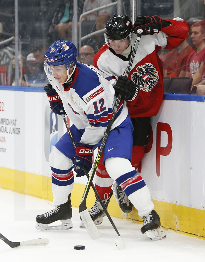 EDMONTON, CANADA, 13.Aug. 2022 – Preliminary Round, AUT vs. USA. Image shows Sasha PASTUJOV #12 (USA) & Lukas HÖRL #3 (Austria). Photo: Werner Krainbucher