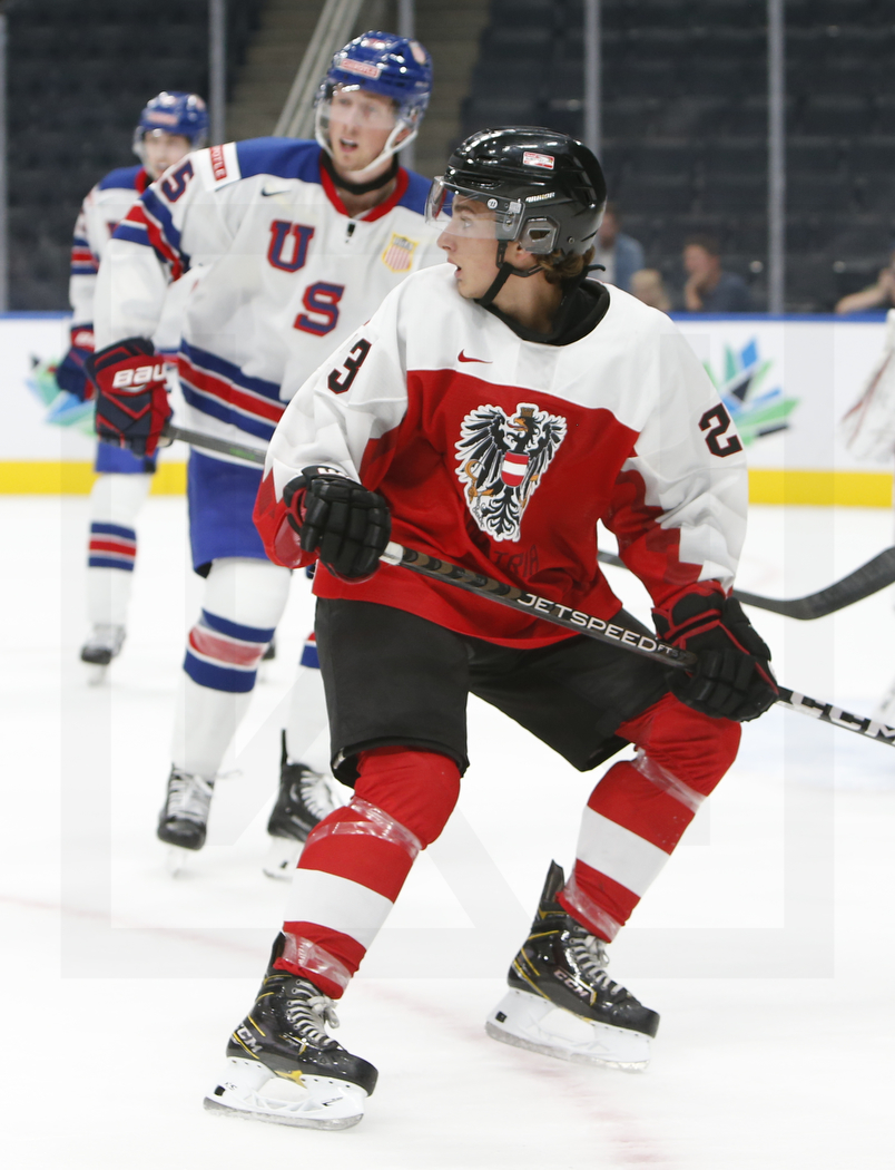 EDMONTON, CANADA, 13.Aug. 2022 – Preliminary Round, AUT vs. USA. Image shows Tyler KLEVEN #25 (USA) & Jonas DOBNIG #23 (Austria). Photo: Werner Krainbucher