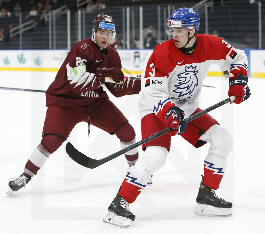 EDMONTON, CANADA, 14.Aug. 2022 – Preliminary Round, CZE vs. LAT. Image shows Felikss GAVARS #25 (Latvia) & David SPACEK #3 (Czech Republic). Photo: Werner Krainbucher