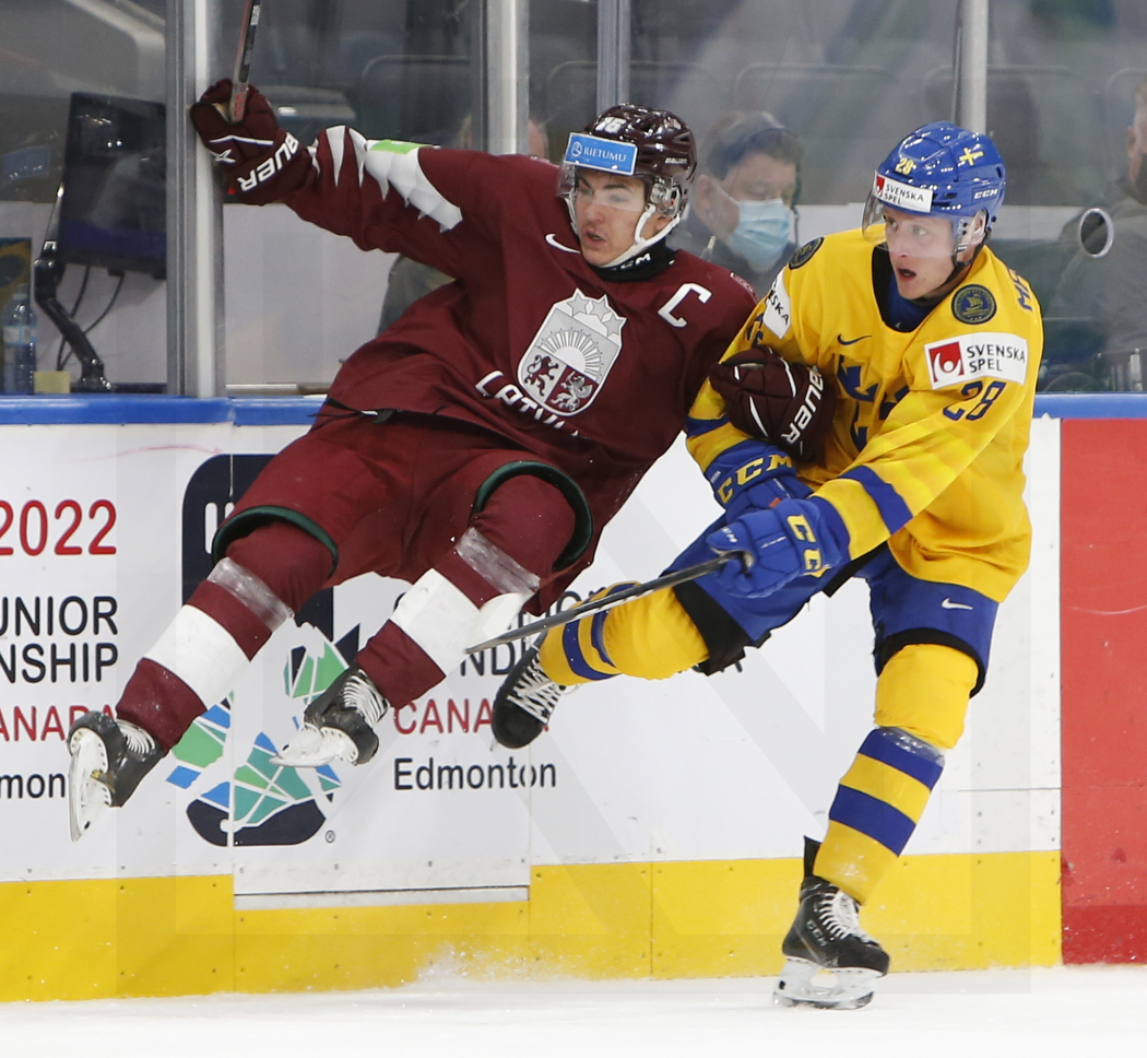 EDMONTON, CANADA, 17.Aug. 2022 – Quarterfinals, SWE vs. LAT. Image shows Ralfs BERGMANIS #16 (Latvia) & Oskar MAGNUSSON #28 (Sweden). Photo: Werner Krainbucher