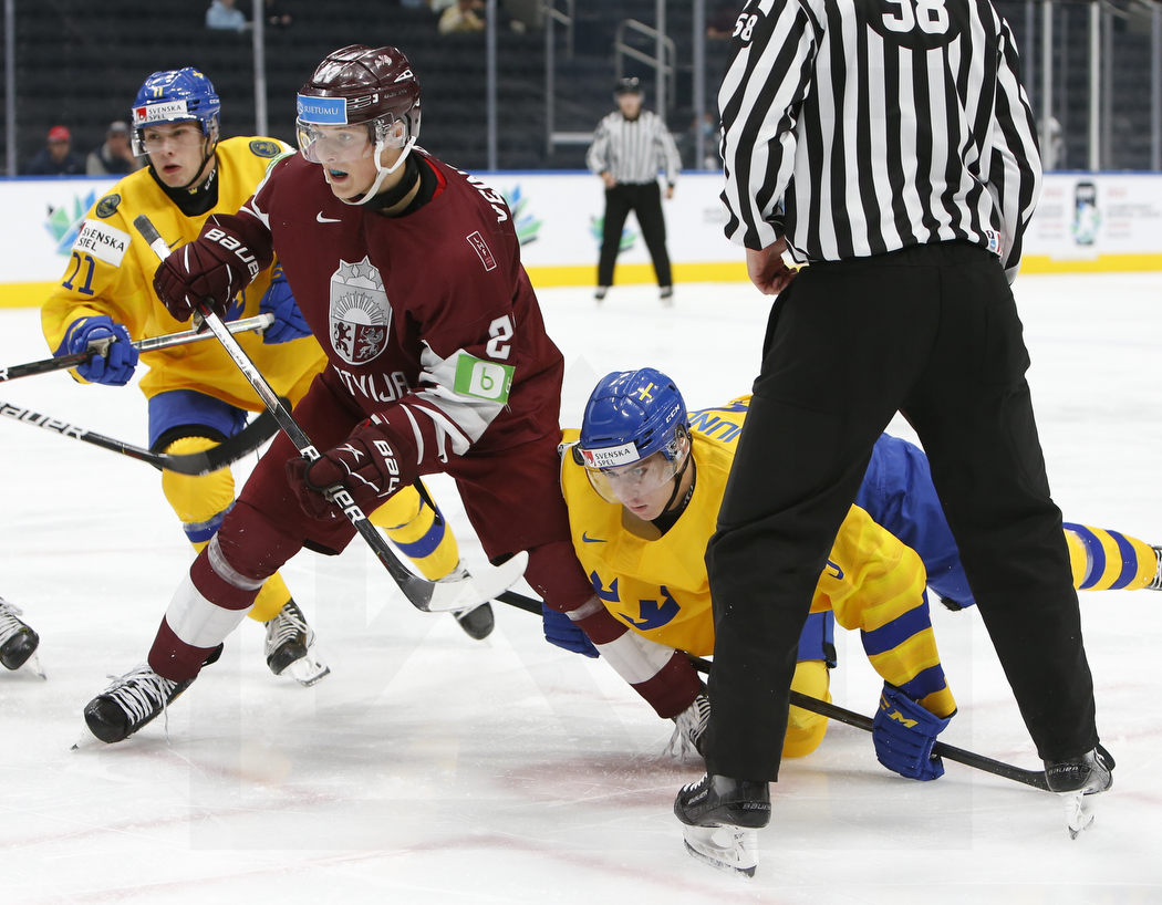 EDMONTON, CANADA, 17.Aug. 2022 – Quarterfinals, SWE vs. LAT. Image shows Fabian LYSELL #11 (Sweden), Klavs VEINBERGS #27 (Latvia) & Daniel LJUNGMAN #9 (Sweden). Photo: Werner Krainbucher