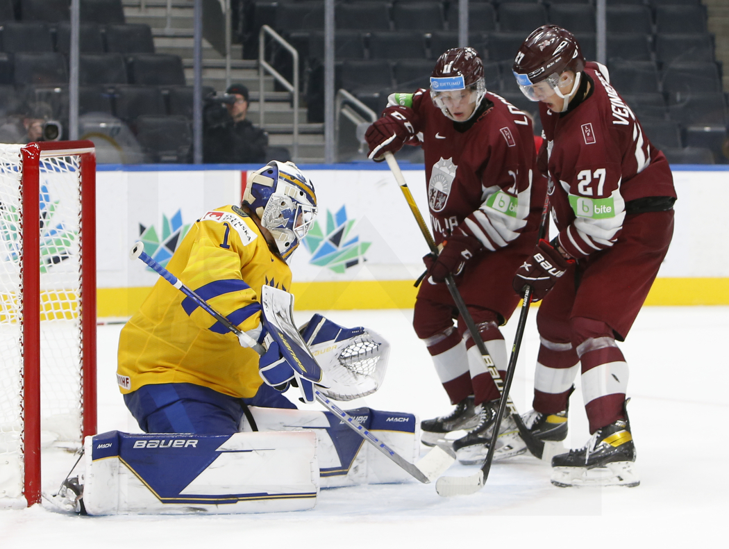 EDMONTON, CANADA, 17.Aug. 2022 – Quarterfinals, SWE vs. LAT. Image shows Jesper WALLSTEDT #1 (Sweden), Dans LOCMELIS #11 (Latvia) & Klavs VEINBERGS #27 (Latvia). Photo: Werner Krainbucher