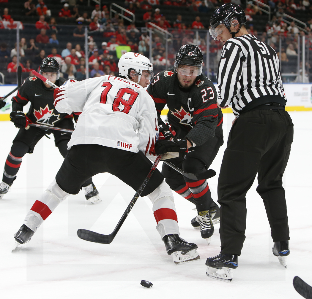 EDMONTON, CANADA, 17.Aug. 2022 – Quarterfinals, CAN vs. SUI. Image shows Joshua FAHRNI #18 (Switzerland) & Mason MCTAVISH #23 (Canada). Photo: Werner Krainbucher