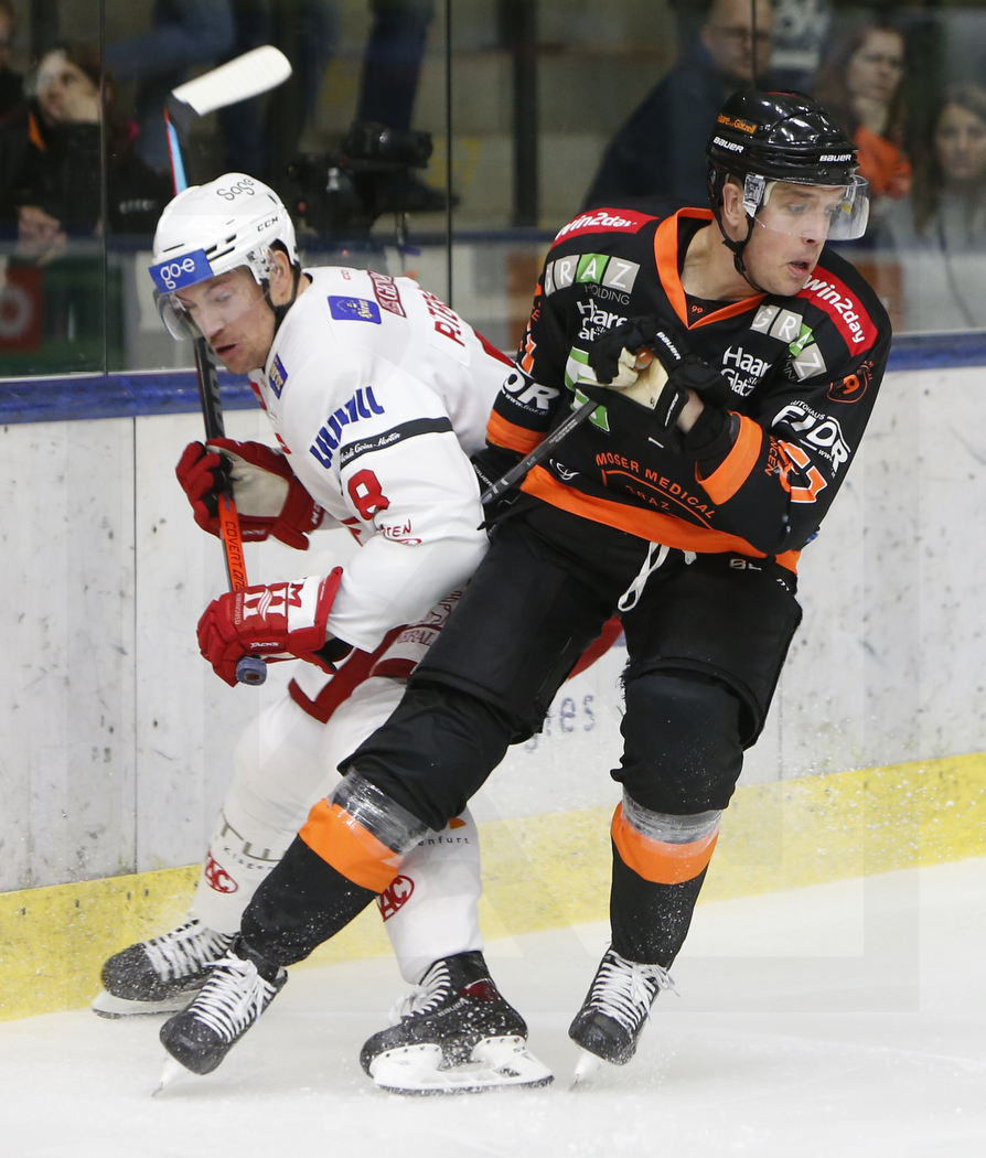 GRAZ, AUSTRIA, 30.Sep. 2022 – Moser Medical Graz 99ers vs. EC KAC. Image shows Nicholas Eric PETERSEN #8 (EC KAC) & Daniel WOGER #51 (Moser Medical Graz 99ers) . Photo: Werner Krainbucher