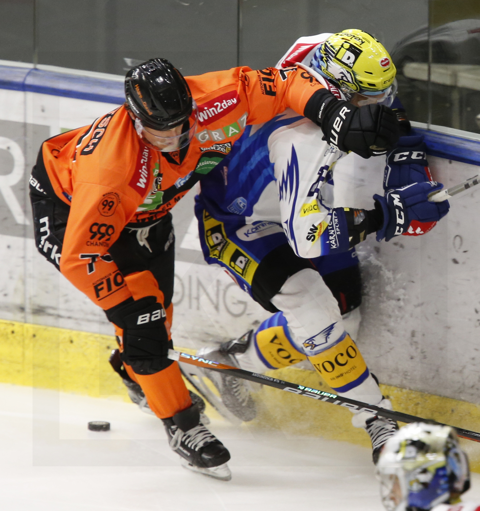 GRAZ, AUSTRIA, 28.Oct. 2022 – Moser Medical Graz 99ers vs. EC iDM Wärmepumpen VSV. Image shows Sam ANTONITSCH #76 (Moser Medical Graz 99ers) & Derek JOSLIN #28 (EC iDM Wärmepumpen VSV). Photo: Werner Krainbucher