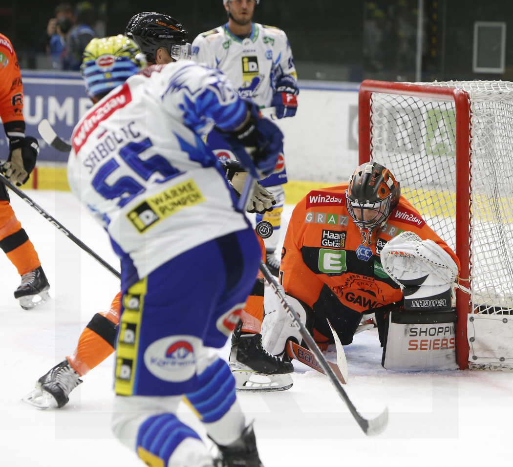 GRAZ, AUSTRIA, 28.Oct. 2022 – Moser Medical Graz 99ers vs. EC iDM Wärmepumpen VSV. Image shows Robert SABOLIC #55 (EC iDM Wärmepumpen VSV) & Christian ENGSTRAND #31 (Moser Medical Graz 99ers). Photo: Werner Krainbucher