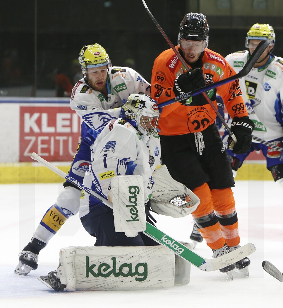 GRAZ, AUSTRIA, 28.Oct. 2022 – Moser Medical Graz 99ers vs. EC iDM Wärmepumpen VSV. Image shows Kevin MODERER #74 (EC iDM Wärmepumpen VSV), Jean Philippe LAMOUREUX #1 (EC iDM Wärmepumpen VSV) & James LIVINGSTON #62 (Moser Medical Graz 99ers). Photo: Werner Krainbucher
