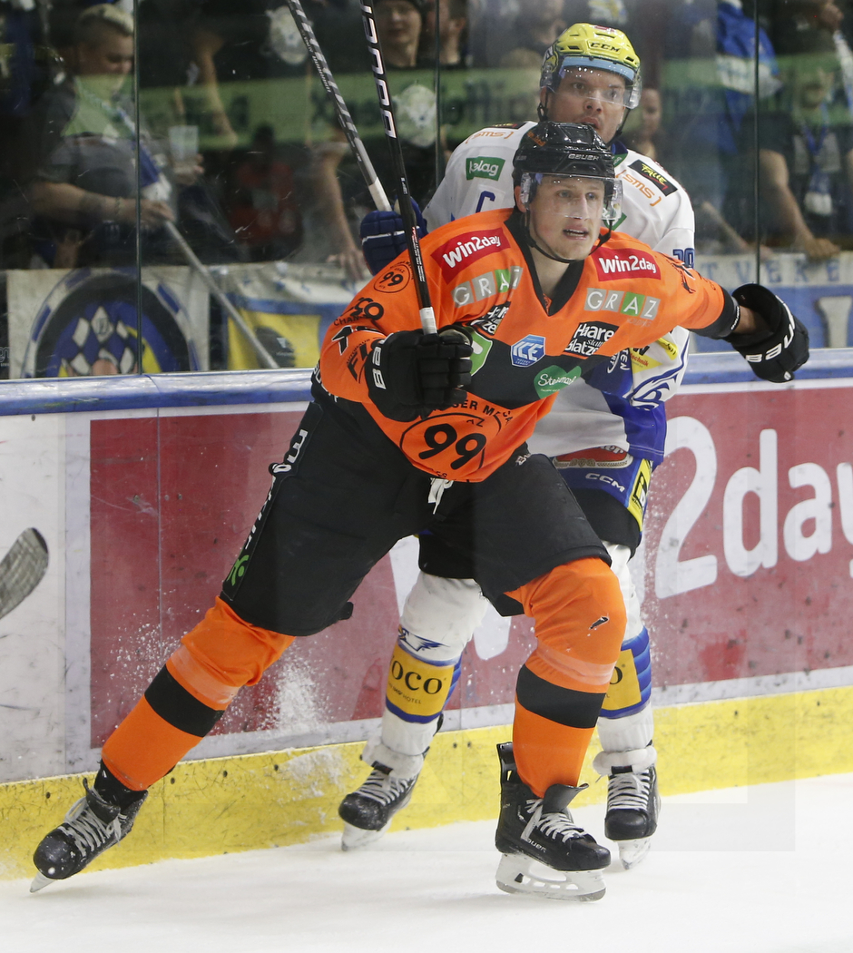 GRAZ, AUSTRIA, 28.Oct. 2022 – Moser Medical Graz 99ers vs. EC iDM Wärmepumpen VSV. Image shows Sam ANTONITSCH #76 (Moser Medical Graz 99ers) & Derek JOSLIN #28 (EC iDM Wärmepumpen VSV). Photo: Werner Krainbucher