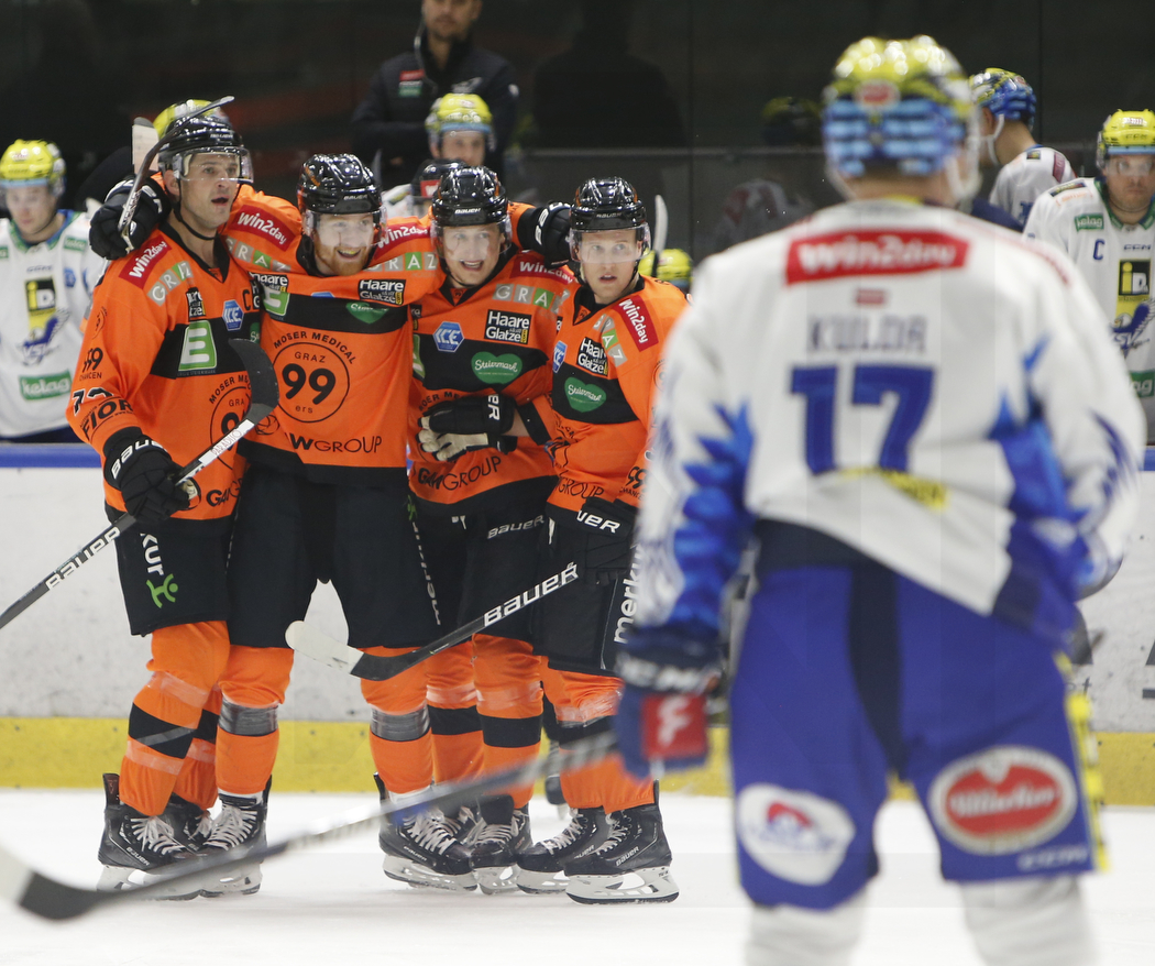 WK20221028_0482 28. Oktober 2022 1050 × 878 WK20221028_0482 GRAZ, AUSTRIA, 28.Oct. 2022 – Moser Medical Graz 99ers vs. EC iDM Wärmepumpen VSV. Image shows 99ers goal celebration. Photo: Werner Krainbucher